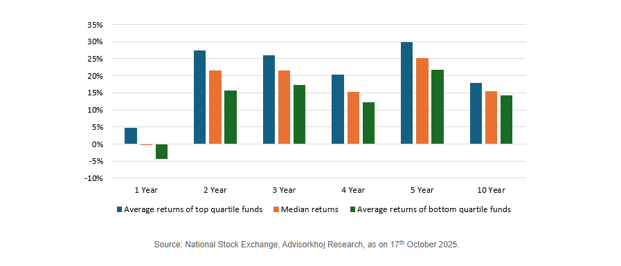 Performance may vary for funds within the same category (see the chart below). You can see that there can considerable median deviation in performance of midcap funds. You should understand that over long investment tenures, even a few percentage point difference in returns can result in substantial difference in wealth creation due to compounding. You should always invest in funds that have long track record of consistent outperformance relative to the benchmark index. You should also look at the performance of other funds managed by the fund manager and the track record of the asset management company (AMC). You should consult with your financial advisor or mutual fund distributor if you need help in selecting funds for your investment portfolio.