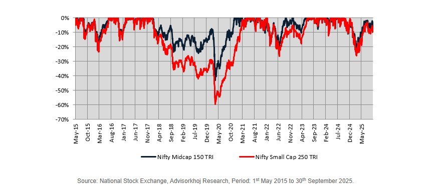 Nifty Midcap 150 TRI experienced smaller drawdowns compared to small caps, represented Nifty Small Cap 250 TRI (see the chart below).