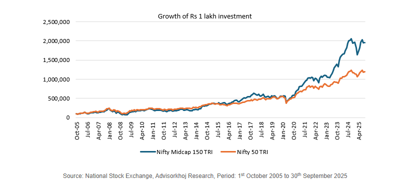 Midcap funds have always been popular with retail investors. Its popularity has only grown further in recent years with midcap funds overtaking large cap funds to become the category with second highest assets under management (AUM) among diversified equity funds. The reason midcap funds are popular with investors, is their wealth creation potential. The chart below shows the growth of Rs 1 lakh investment in Nifty Midcap 150 TRI versus the Nifty 50 TRI – your investment would have multiplied 19X in the midcaps (versus 12X in Nifty 50).