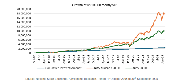 Systematic investment plans (SIPs) are popular investment avenues for retail investors, especially for investing in midcap funds. Midcap funds are best suited for long investment tenures (see table above). Through SIP you can keep investing relatively small amounts and remain invested over long investment tenures. The relatively high volatility of these funds also make them suitable for SIPs. SIPs take advantage of volatility through Rupee Cost Averaging. The chart below shows the growth of Rs 10,000 SIP in Nifty Midcap 150 TRI versus Nifty 50 TRI over the last 20 years. With a cumulative investment of just Rs 24 lakhs, you could have accumulated a corpus of ~ Rs 1.8 crores in Nifty Midcap 150 TRI (versus ~Rs 1 crore in Nifty 50 TRI)