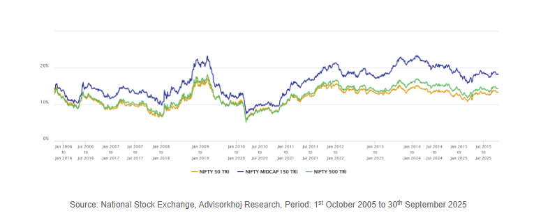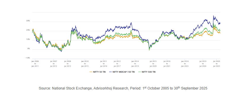 The chart below shows the 5 year rolling returns of Nifty Midcap 150 TRI versus the Nifty 50 TRI and the broader market index, Nifty 500 TRI over the last 20 years. You can see that Nifty Midcap 150 TRI outperformed the other two indices most of the time.