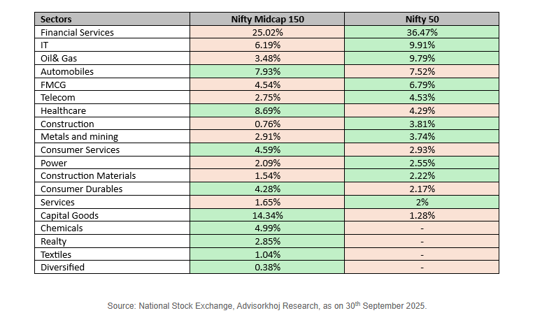 The universe of midcap stocks (150 stocks) is broader than large caps. Midcaps provide broader sector exposure than large cap stocks. There are several sectors dominated by midcap stocks, where large cap stocks have no presence. Midcaps can add richer diversification to your equity portfolio.