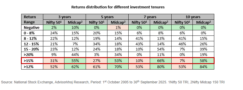 Midcaps outperformed large caps and broad market over longer investment tenures