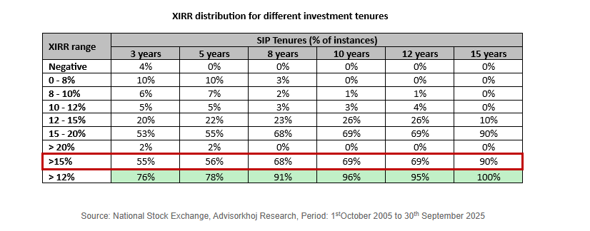 The below shows the XIRR distribution of Nifty Midcap 150 TRI for different investment tenures. Over 10 years plus SIP tenures you can 12+ XIRR returns in 96% of instances and 15%+ XIRR returns in ~70% of instances (marked in red). The table below shows the importance of having long SIP tenures for your midcap funds.